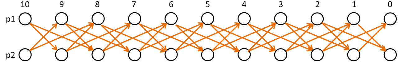 At the start of Nim(10), it is Player 1’s turn with 10 tokens available. We can label this state p1-10, for “Player 1 with 10 tokens available”. When Player 1 takes a token, the state is now p2-9 (or, if Player 1 takes two tokens, p2-8).